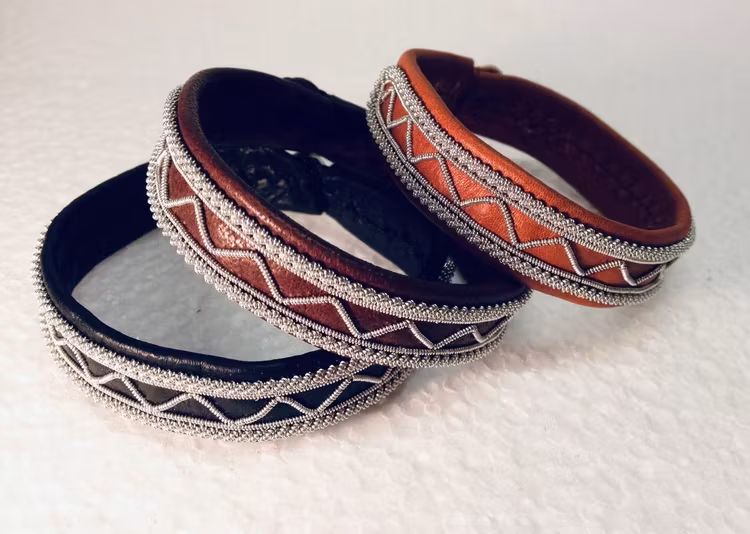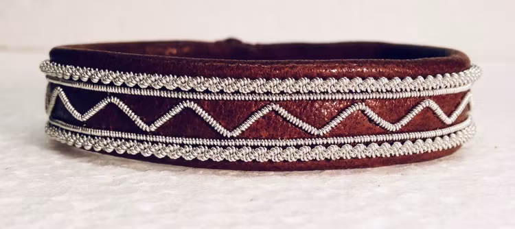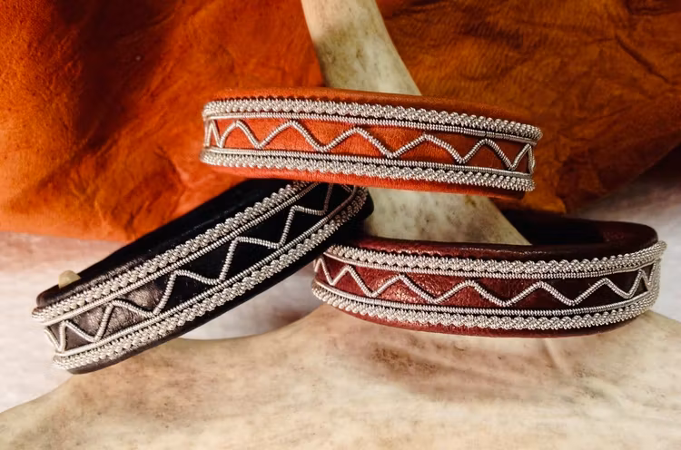 A45 0 kr 620 kr Färg Svart Antik Brun Natur Blå Röd Grå Längd 16 cm 16.5 cm 17 cm 17.5 cm 18 cm 18.5 cm 19 cm 19.5 cm 20 cm 20.5 cm 21 cm 21.5 cm 22 cm 22.5 cm 23 cm Läderarmband i vegetabiliskt garvat renskinn med renhornsknappTvinnad tenntråd med 4% silver, broderat mönster i mittenBredd ca 1,5 cm.
