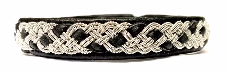 Tenntrådsfläta med läderrem inflätad. Tenntråden innehåller 4% silver.