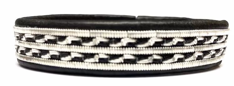 Platt tenntråd, tenntråd och svart koppartråd emellan. Tenntråden innehåller 4% silver.