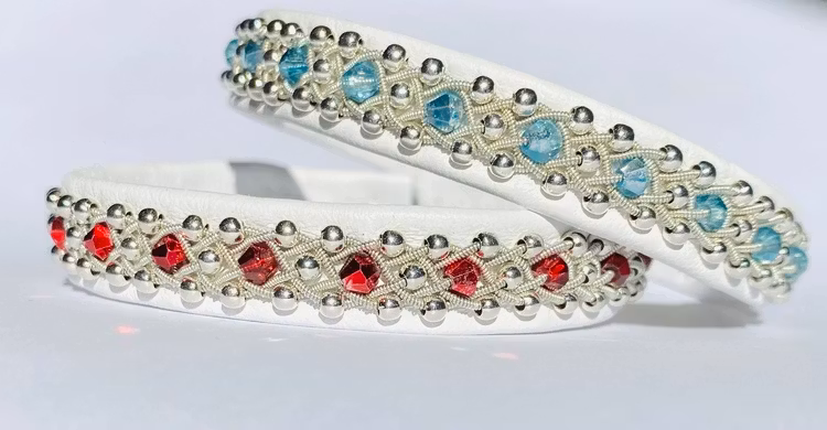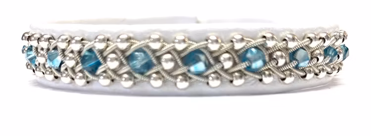 Tenntrådsfläta med facetterade färgade pärlor + silverpärlor. Skriv på kommentarsraden vilken färg som önskas på den färgade pärlan.