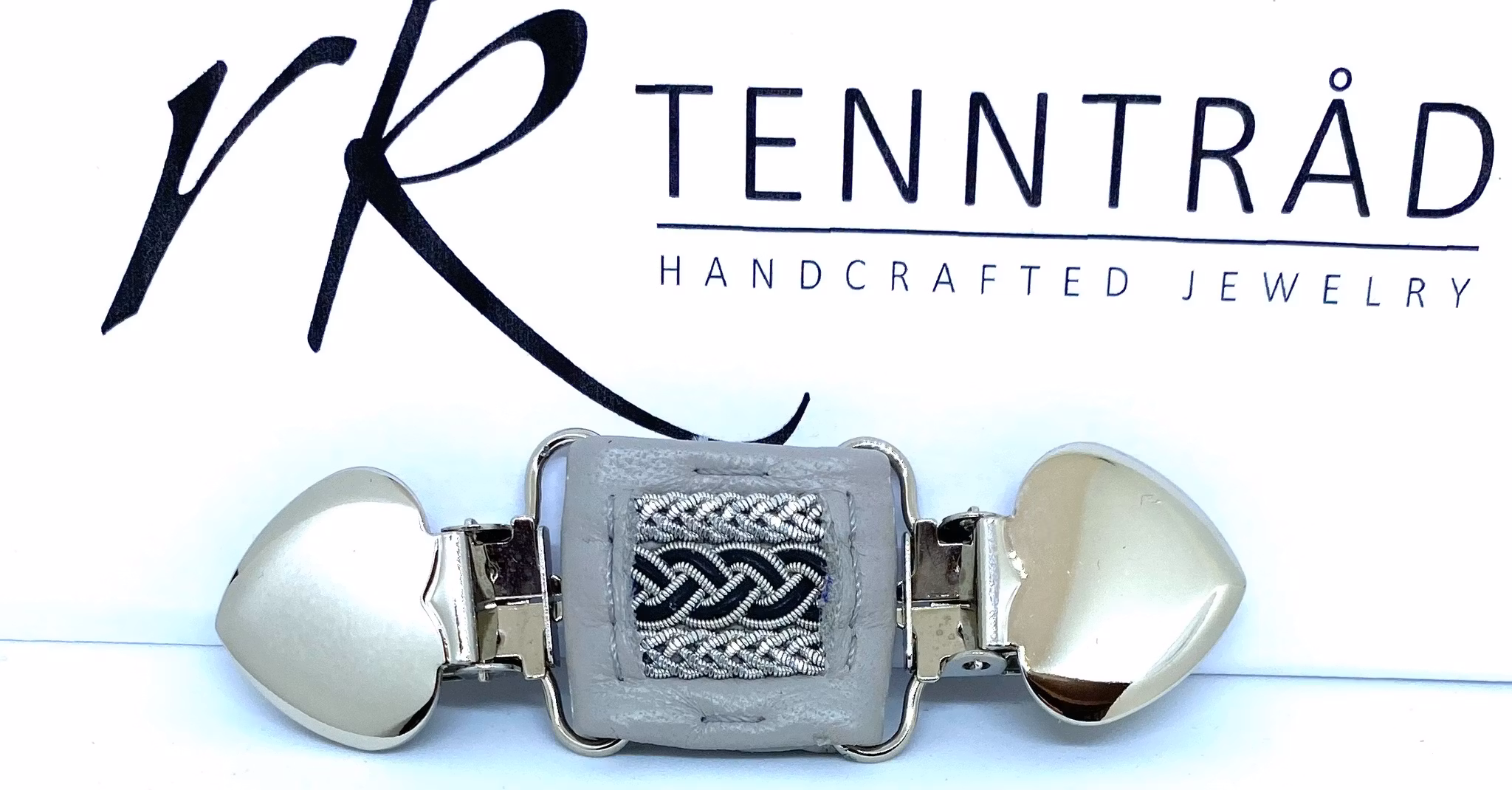 Spänne till koftan. Tenntrådsflätor på renskinn.. Skinndelen är cirka 3 cm lång och 2 ,5 cm bred. Clipsen är i metall.
