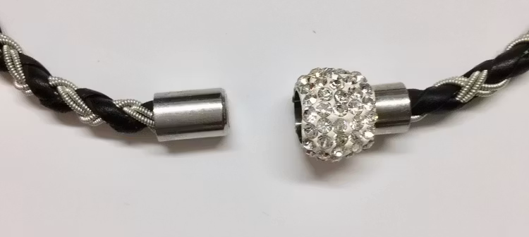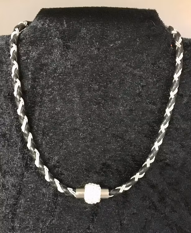 Dagsten 0 kr 350 kr Längd 42 43 44 45 46 Färg Svart Antikbrun Naturbrun Blå Röd Halsband med rundflätad skinn och tenntråd. Magnetlås i strass.